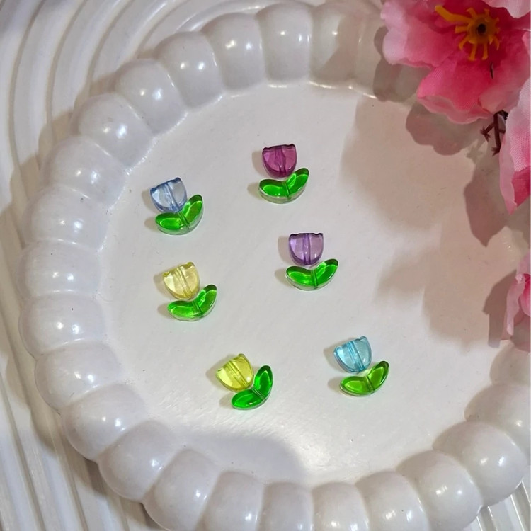 آویز لاله همراه برگ در رنگهای متنوع لاله ها و برگها دارای سوراخ میباشند برای رد کردن میخ،نخ.. مناسب انواع دستبند،بند موبایل...
