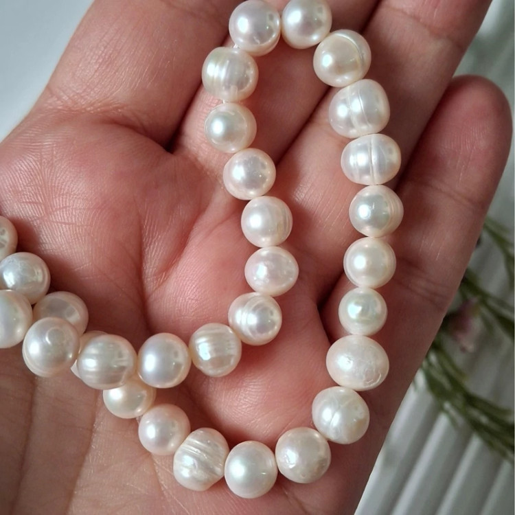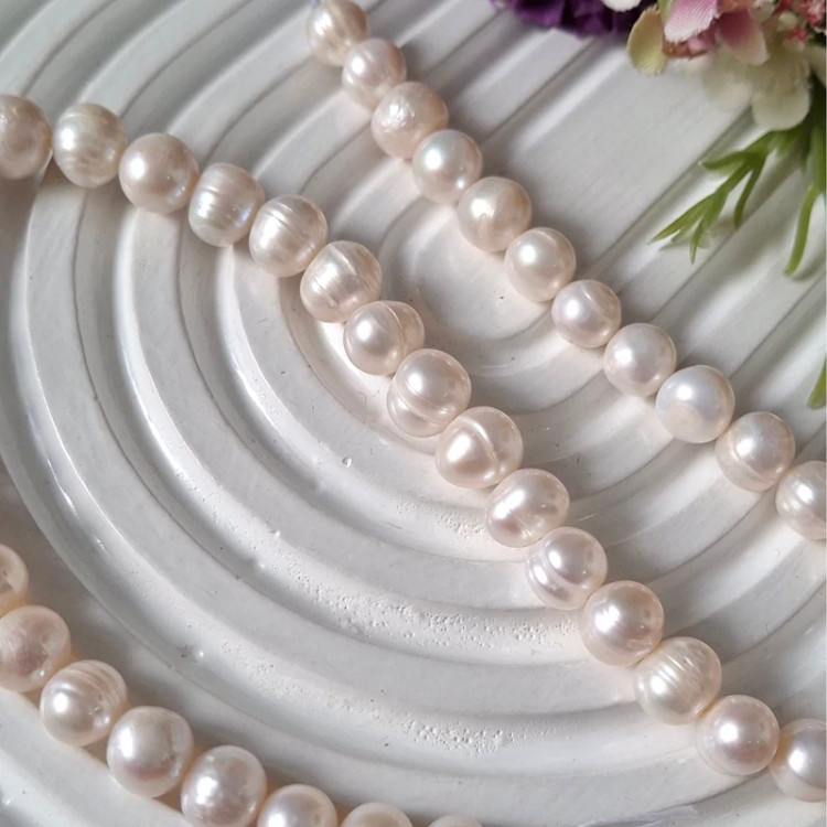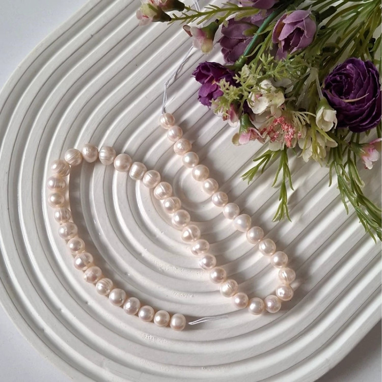 مروارید پرورشی نامنظم سایز بین 7 و 8 فروش بصورت ریسه ای تعداد مروارید ها در هر ریسه 43 عدد با کیفیت عالی